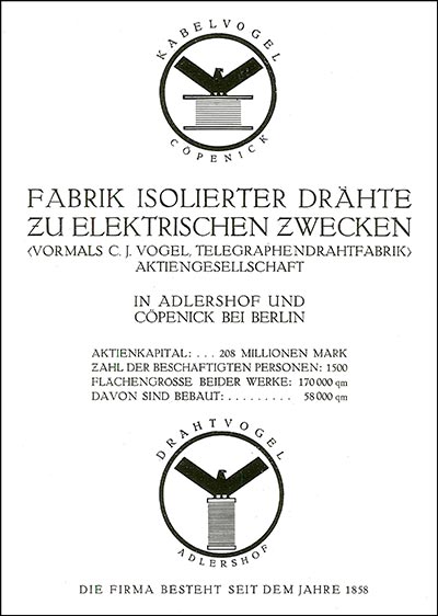 Firmengeschichtezusammengetragen von: Jürgen TiedmannAbweichungen aus verschiedenen Quellen sind mit roter Kursivschrift gekennzeichnet. 1858 - 1897 - C. J. Vogel, TELEGRAPHENDRAHT=FABRIK![]() Im Januar 1858 gründete Julius Vogel die Firma "C.J. Vogel, TELEGRAPHENDRAHT=FABRIK". Die Firma befand sich anfangs in gemieteten Räumen. Diese bestanden aus 3 Zimmern und einer Küche. Es gelang sehr schnell große Kunden zu gewinnen, darunter Siemens & Halske. 1864 Erwerb eines Hauses in der Berliner Ritterstr. 39. Dieses wurde der erste eigene Firmensitz. In diesem Haus befand sich bereits eine Drahtzieherei welche später gekauft wurde. Am 1.4.1880 - 1885 trat der älteste Sohn von C.J. Vogel, Max Vogel, in das Unternehmen ein. 1886 trat der jüngere Sohn von C.J. Vogel, Otto Vogel, in das Unternehmen ein. 1889 siedelte die Firma in neu errichtete Fabrikanlagen auf einem, zuvor erworbenen, Grundstück in Adlershof bei Berlin um.