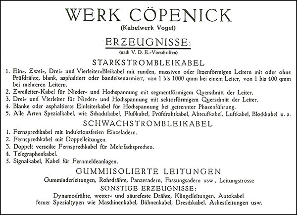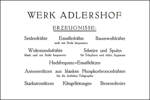 Das Werk in Adlershof stellte weiterhin Drähte aller Art von 0,03 mm aufwärts, Litzen, Honeycomb-, Trafo-, Fernhörerspulen, sowie Lautsprecher-, Kopfhörer- und Batterieschnüre her. Rahmenantennen.