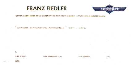 Franz Fiedler war nach einem Briefkopf Generalvertreter der "Continental Rundfunk GmbH Wandel und Goltermann" mit dem Markenzeichen "Imperial" und einer Anschrift in Frankfurt/Main.