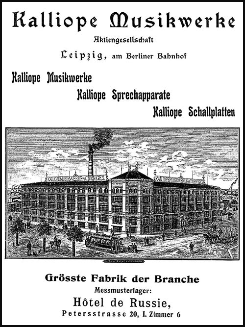 1895 - 1898 - Kalliope Fabrik mechanischer Musikwerke, Espenhain, Wacker & Bock1895 tritt Gustav Max Espenhain in die Firma "Wacker & Bock" ein. Es erfolgt eine Umbenennung in "Kalliope Fabrik mechanischer Musikwerke".Firmeninhaber waren Gustav Max Espenhain, Christian Heinrich Richard Bock und Emil Moritz Anton Wacker. Der Firmensitz war in Leipzig-Gohlis, Dorotheenstr.20. "Kalliope" war neben der "Grammophon" die älteste Plattenmarke in Deutschland. Die ersten Platten entstanden weit vor dem ersten Weltkrieg. 1898 - 1919 - Kalliope Musikwerke AGAm 18.5.1898 wurde die Firma in eine Aktiengesellschaft mit einer Einlage von 600.000 Mark umgewandelt.Espenhain, Wacker und Bock waren die Inhaber der Aktien und bildeten auch den Vorstand. 1899 wurde der Firmensitz in die neuerbaute Fabrik in der Bitterfelder Str. 1 in Leipzig verlegt. Am 22.11. scheidet Gustav Espenhain aus dem Vorstand aus.