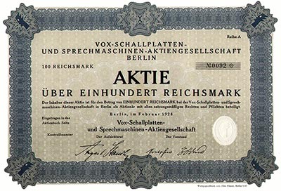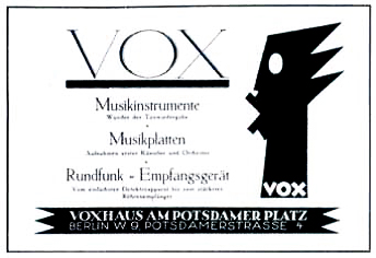 1919 war in einer Anzeige von "Menzenhauer" zu lesen: 1929 geriet, im Zuge der Weltwirtschaftskrise, auch "Menzenhauer & Schmidt" in Schwierigkeiten. 1930 gelingt noch die Einführung der unzerbrechlichen Schallplatte MELOCORD. Im Februar 1931 meldet Menzenhauer Konkurs an. Bruno Castner (Isiphon Concert Record GmbH) erwirbt aus der Konkursmasse der "KALLIOPE" Studio und Teile des Matritzenbestandes (siehe weiter unten). 1920 - 1921 - TegestiAm 30.12.1920 wurde die "Vox-Schallplatten- und Sprechmaschinen-AG" unter den Namen "Tegesti" gegründet und am 19. Februar 1921 ins Firmenregister eingetragen. Die Muttergesellschaft der Vox und anderer Firmen war die "Hauptgesellschaft für Industrien", die von Otto Klung, Curt Stille und August Stauch gegründet wurde. Strauch, der sein Vermögen im Diamantenhandel in Südwestafrika gemacht hatte, war Hauptgeldgeber.Noch 1920 erwarb dieses Unternehmen das, von 1907 bis 1908 gebaute, fünfgeschossige Bürohaus in der Potsdamer Straße 4 am Potsdamer Platz in Berlin, später bekannt als "Vox-Haus". Am 10. Mai 1921 erhielt die Firma dann ihren späteren Namen, unter dem sie bekannt wurde. 1921 - 1929 - Vox-Schallplatten- und Sprechmaschinen-AGDer Name "Vox" wurde nach dem lateinischen Wort für Stimme gewählt und als Handelsmarke geschützt. Der Werbegrafiker Wilhelm Deffke setzte dieses Wort als Markenzeichen grafisch um. Es entstand der (von ihm so genannte), im Profil gestaltete "Negerkopf", dessen Lippen zum Singen weit geöffnet sind und den Buchstaben "V" bildeten. Das "O" ließ sich in der runden Form des Auges wiedererkennen, das "X" ansatzweise in der Frisur.