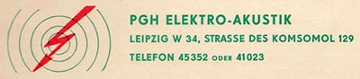 Firmengeschichte1948 - 1958 - Gebrüder Israel, Elektro-Akustik, Leipzig1948 wurde die Firma durch die Brüder Gerhard und Heinz Israel als Ingenieurbüro in der Ruststr. 11 in Leipzig gegründet. Der Haupsitz der Firma wurde kurz danach in die Carl-Goerdeler-Str. 129 (heute Dieskaustr.) verlegt.Hersteller von Geräten der Studiotechnik, Tonbandgeräte, Mischpulte, Verstärker, Tonsäulen. Danach "PGH Elektro-Akustik Leipzig". 1958 - 1972 - PGH Elektro-Akustik Leipzig (EAL)Die "PGH Elektro-Akustik Leipzig" geht 1958 aus der Firma "Gebrüder Israel" hervor. Der Firmensitz war an gleicher Stelle, zu dieser Zeit Straße des Komsomol 129. Es wurden hauptsächlich hochwertige Studiobandmaschinen für Rundfunk, Theater u.a. hergestellt.