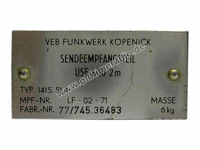Stationärer, quarzstabilisierter Sender und Empfänger für Wandmontage. Modulationsart F3, 3 Kanäle mit einem Abstand von 25 kHz. Sende- und Empfangsfrequenzen: 173,900 MHz, 173,925 MHz, 173,950 MHz. Nennausgangsleistung des Senders 10 Watt. ET-Ruf 1750 Hz. Das Gerät hat folgende Steckverbinder: Messerleiste 31 polig, Antennenbuchse UC 1-G3, Bajonettstecker EBD TGL 24685.