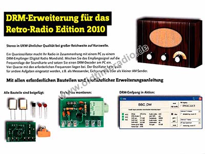 Diese Baugruppe ermöglichte den Empfang von DRM-Sendern in Verbindung mit dem Kurzwellen-Bausatz-Radio von Conrad, einem PC mit Soundkarte und entsprechender Decoder-Software. Sie arbeitete auf der Basis eines Quarz-Oszillators welcher auch für andere Aufgaben eingesetzt werden kann, z.B als AM-Messsender, Eichgenerator oder als kleiner AM-Sender. |