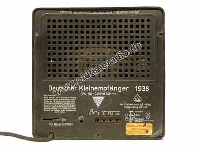 Im zarten Radioalter von 6 - 7 Jahren (in dem ein Mensch seine Milchzähne verliert) erhielt Deutschland von den damaligen Alliierten (USA, GB, UdSSR, Frankreich) strenge Auflagen zur "Entnazifizierung". Die Nicht-Einhaltung war eine Straftat und wurde z.B. mit Zuchthaus bestraft. Davon war auch dieses Radio betroffen. Hierzu wurde das Emblem (Hakenkreuz) auf der Vorderseite des Gehäuses sehr sorgfältig heraus geschliffen und dabei, glücklicherweise, kein weiterer Schaden gemacht. Der DKE hätte nicht wieder verkauft werden dürfen wenn er nicht auch "entnazifiziert" wurde. Diese nachträgliche Veränderung ist Teil der Geschichte und keinesfalls wertmindernd! Eine "Entnazifizierung" im Inneren des Gerätes erfolgte nicht.