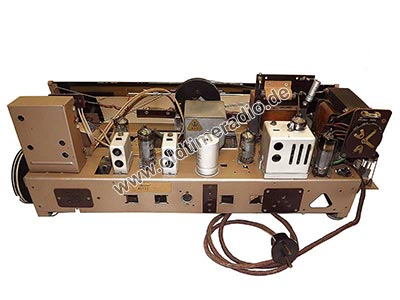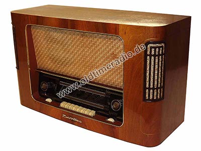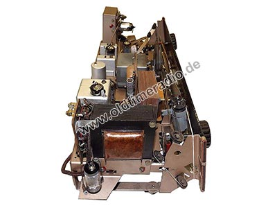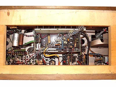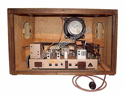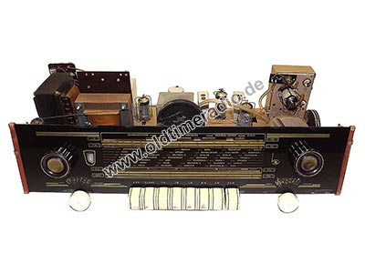 Das Radio hat getrennte Höhen- und Tiefenregelung, Klangtaste, Diodenanschluß für Tonbandgerät, Schwungrad-Duplexantrieb der Abstimmung.