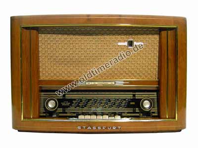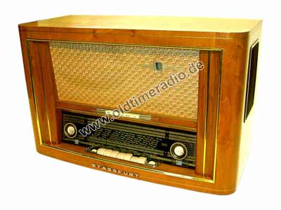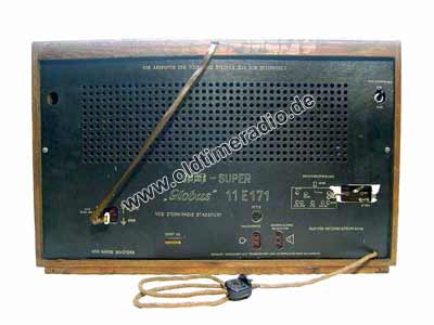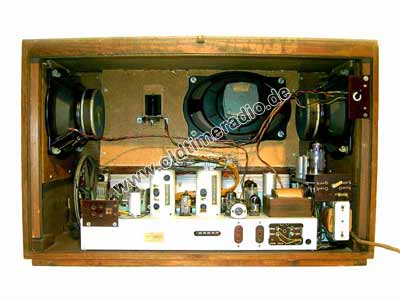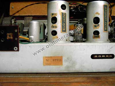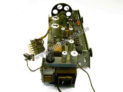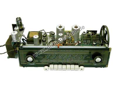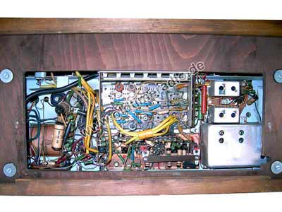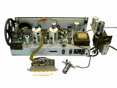 5-Tasten Klangregister, UKW Ferntaste. In diesem Gerätetyp ist (im Gegensatz zu den meisten anderen Radios) die EM 80 "richtig" herum, also stehend mit den Stiften nach unten, eingebaut.