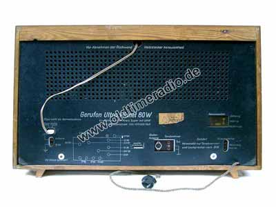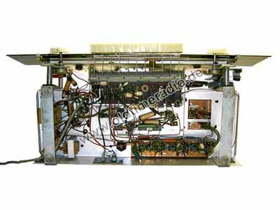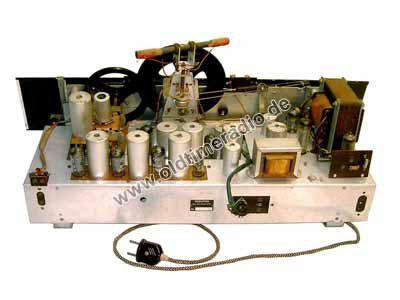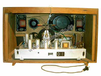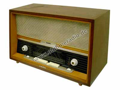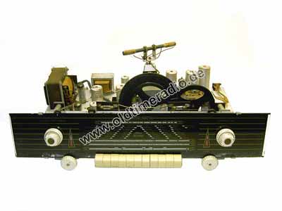 Ein sogenannter Großsuper mit 4 L-Ton. Sehr interessanter Antrieb: durch Betätigung des UKW-Wellenschalters wird über einen zusätzlichen Seilzug mechanisch die AM/FM-Umschaltung betätigt. Dadurch bewegen sich alternativ die unterschiedlichen Seilantriebe zur Abstimmung einschließlich der Skalenzeiger.