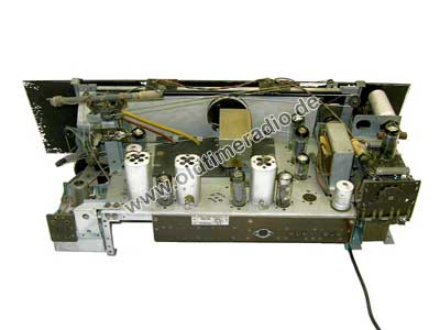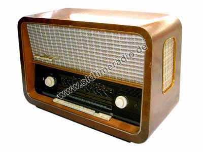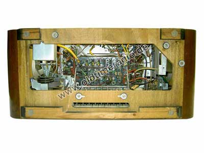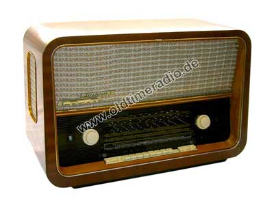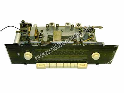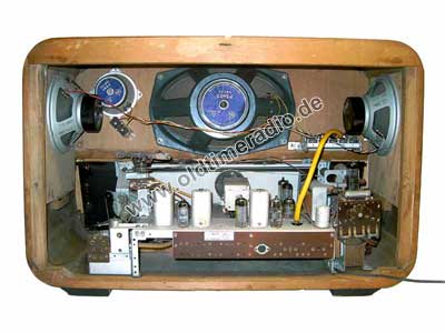 Ein sogenannter Großsuper mit 3 D-Ton. Sehr interessanter Antrieb: durch Betätigung des UKW-Wellenschalters wird über einen zusätzlichen Seilzug mechanisch die AM/FM-Umschaltung betätigt. Dadurch bewegen sich alternativ die unterschiedlichen Seilantriebe zur Abstimmung einschließlich der Skalenzeiger.