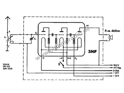 Die Loewe-Mehrfachröhre "3 N.F." enthält drei Röhrensysteme mit den entsprechenden Kopplungselementen. Sie arbeitet ohne Rückkopplung (Anschluss für 1. Anode ist zwar in den Sockel herausgeführt aber nicht angeschlossen - im Bild 14 gut zu sehen) mit Widerstands-Spannungsverstärkung nach v. Ardenne und Heinert. Als Koppelelemente sind "Loewe Vakuum-Hochohmwiderstände" (Type F.Z. 128) und "Loewe Vakuum-Blockkondensatoren" (Type V.C. 100) verwendet.