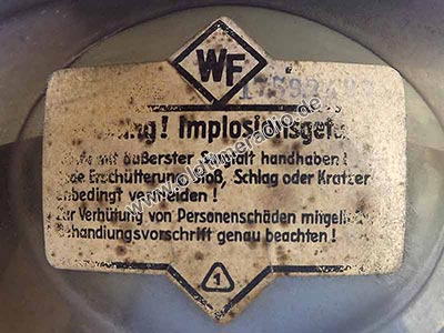 Fernsehbildröhre, nutzbare Schirmabmessung: 240 x 180 mm. Die Röhre wird magnetisch fokussiert und magnetisch abgelenkt (Buchstabe "M").