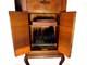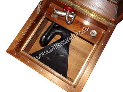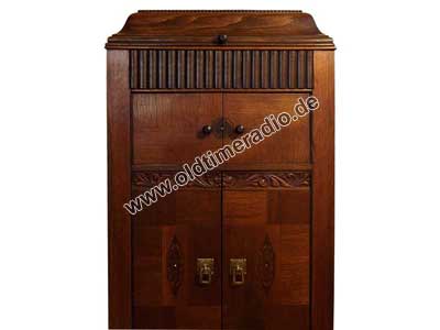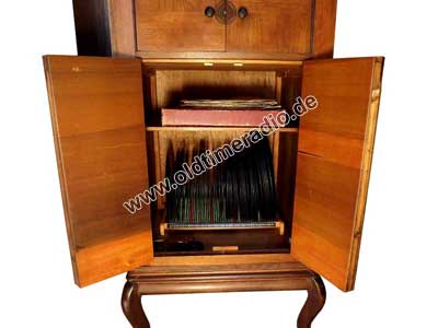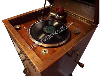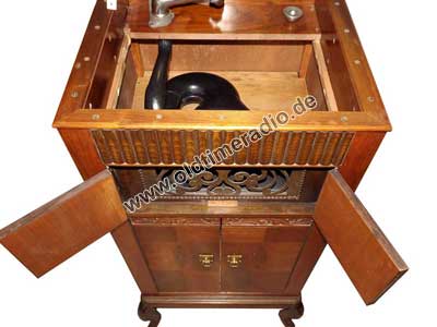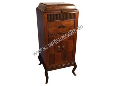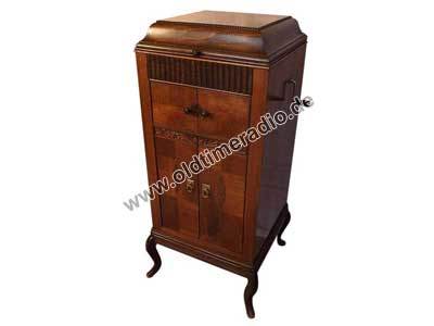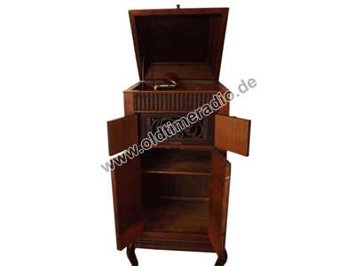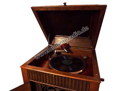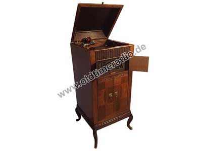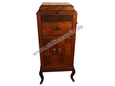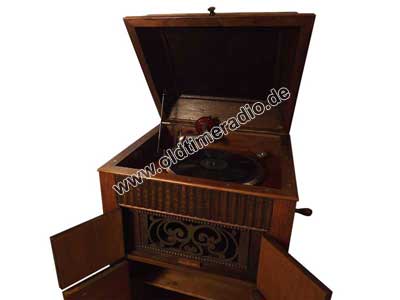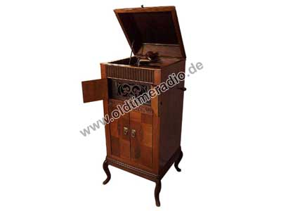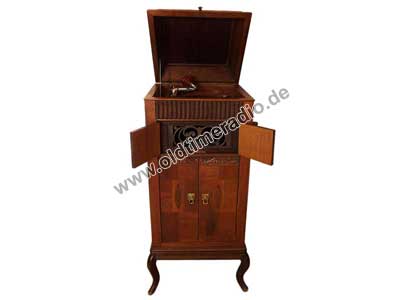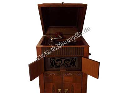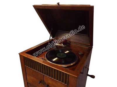 Grammophonschrank mit mechanischem Federantrieb und mechanischer Tonwiedergabe. Die Abspielgeschwindigkeit liegt um 78 U/min und ist stufenlos von Adagio bis Presto regelbar.