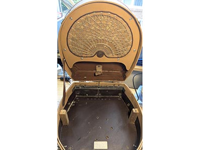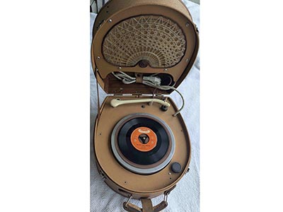 Monoplattenspieler, Fonokoffer mit im Deckel eingebautem Lautsprecher. 3-Touren-Laufwerk mit 33, 45 ,78 Upm.