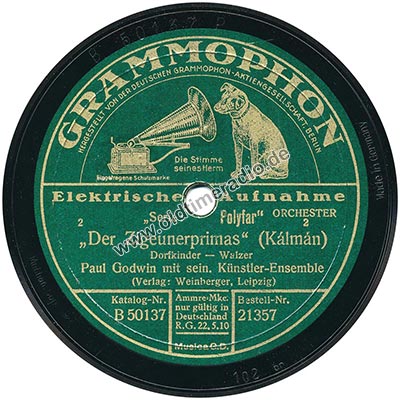 Die Stimme seines Herrn, eingetragene Schutzmarke, ORCHESTER, 2, Ammre-Mke. Nur gültig in Deutschland R.-G. 22.5.10, MUSICA G.D. |