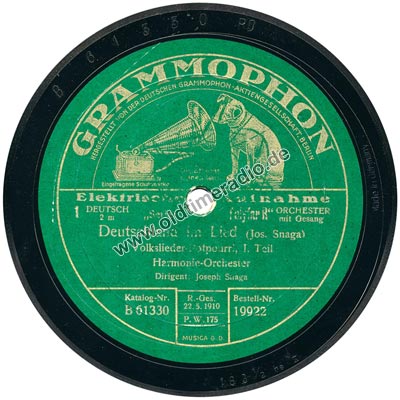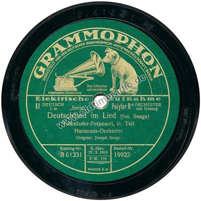 Die Stimme seines Herrn, eingetragene Schutzmarke, DEUTSCH, ORCHESTER mit Gesang, 2m, Elektrische Aufnahme, R.-Ges. 25.5.1910, P.W. 175, MUSICA G.D. |