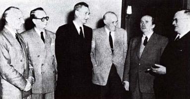 Das Bild zeigt die feierliche Überreichung der neuen Satzung durch den politischen Berater des britischen Mitlitärgouverneurs, Mr. Steel (links) an den Vorsitzenden des Hauptausschusses des "NWDR", Präsident Dr. Kieselbach (rechts). Am 11.06.1948 erfolgt eine einstündige Direktsendung des einzigen, zugleich über ost- und westdeutsche Sender verbreiteten, manuskriptlosen und unzensierten, politischen Streitgesprächs zwischen Vertretern des "NWDR" und des Rundfunks in der sowjetischen Besatzungszone. Ab 1950 folgten auf UKW zwei regionale Hörfunkprogramme, NWDR Nord und NWDR West. Ab dem 06.04.1950 betrieb der "NWDR das Westfalenstudio in Dortmund. Das Studio wurde von Dr. Peter Funk geleitet. Es wurde gegründet, da 24 Prozent aller NWDR-Hörer in Westfalen lebten. Sie sollten einen stärkeren Anteil im Programm finden. Insbesondere die Sendung "zwischen Rhein und Weser" diente diesem Zweck. Am 05.06.1950 wurde der "NWDR" Gründungsmitglied der "ARD" als freiwilliger "Verbund öffentlich-rechtlicher Rundfunkanstalten in Deutschland".