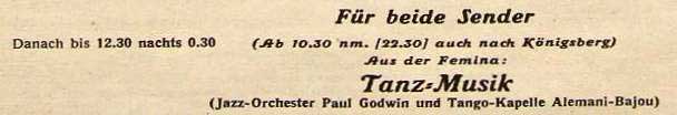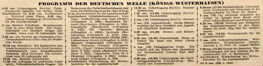 Programm "Deutsche Welle"zusammengetragen von: Jürgen TiedmannIm August 1924 wurde in Berlin der Hörfunksender "Deutsche Welle GmbH" von Ernst Ludwig Voss gegründet. Bis zu diesem Zeitpunkt besaß Deutschland neun Rundfunkgesellschaften mit bezirksmäßiger Begrenzung. Die Deutsche Welle sollte nun ihre Darbietungen über das ganze Reich und weit über die Landesgrenzen verbreiten. Sie sollte weniger dem Unterhaltungsrundfunk, sondern mehr dem Gedanken der "Volkshochschule" entsprechen und damit im Dienst des ganzen Volkes praktische Fortbildungs- und Erziehungsarbeit leisten. Am 7.1.1926 ging die "Deutsche Welle GmbH" regelmäßig auf Sendung. Eigentümer waren zunächst zu 70 % die Reichs-Rundfunk-Gesellschaft und zu 30 % das Land Preußen. Die Leitung der Sendegesellschaft hatte Prof. Dr. H. Schubotz. An seiner Seite wirkten erfahrene Rundfunkfachleute am systematischen Programmaufbau mit. Diese waren Dr. Hans Roeseler, Dr. Konrad Dürre, Dr. Karl Würzburger und Studienrat Friebel welcher als Beauftragter des "Zentralinstituts für Erziehung und Unterricht" den pädagogischen und den Schulfunk betreute. Gesendet wurde anfangs mit 20 kW auf der Langwellenfrequenz 231 kHz nur aus Königs Wusterhausen. Die dortige Sendeanlage wurde als "Deutschlandsender I" bezeichnet.