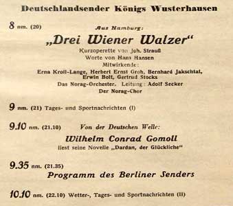 Am 1.1.1933 wurde die "Deutsche Welle GmbH" offiziell in die "Deutschlandsender GmbH" überführt. Programm "Deutschlandsender"Der "Deutschlandsender" war einer der ältesten deutschen Hörfunksender. Der Name Deutschlandsender war von 1926 bis 1972 und von 1990 bis 1993 in Gebrauch.Das Programm des "Deutschlandsenders" vom 28.2.1936:
