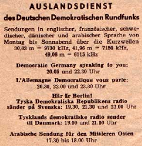Programm "Die Stimme der Frauen der Welt"zusammengetragen von: Jürgen TiedmannAm 20.03.1954 begann der DDR-Rundfunk seinen Auslandsdienst. Mit der Zuspitzung des kalten wurden neue Kurzwellenzentren in beiden deutschen Staaten aufgebaut. Als "Die Stimme der Frauen der Welt" wurde, vorerst nur montags, 19:00 Uhr in Französisch, 19:10 Uhr in Deutsch und von 19:20-19:30 Uhr in englischer Sprache gesendet. Ab dem 02.01.1955 wurde die Sendezeit verlängert und an zwei Tagen pro Woche nach folgendem Plan gesendet: Montags 20:30 Uhr in Französisch, 20:40 Uhr in Deutsch, 20:50-21:00 Uhr in englischer Sprache und Dienstags 01:00 Uhr in Spanisch, 01:10-01:20 Uhr in Englisch. Programm "Radio DDR International"15.04.1955 18:00 Uhr begannen unter der Bezeichnung "Radio DDR International" die ersten Auslandssendungen des "Rundfunks der DDR". Als Pausenzeichen wurde "Alle Menschen werden Brüder...." mit den Klängen aus dem Schlusssatz der 9. Sinfonie von Ludwig van Beethoven verwendet.Im Jahre 1956 werden Sendungen in Schwedisch (ab 01.05.1956) und Dänisch (ab 01.12.1956) aufgenommen. Am 01.04.1957 wurde die erste Sendung Arabisch ausgestrahlt. Es folgten Versuchssendungen in Finnisch, Spanisch, Italienisch, Persisch und Türkisch.