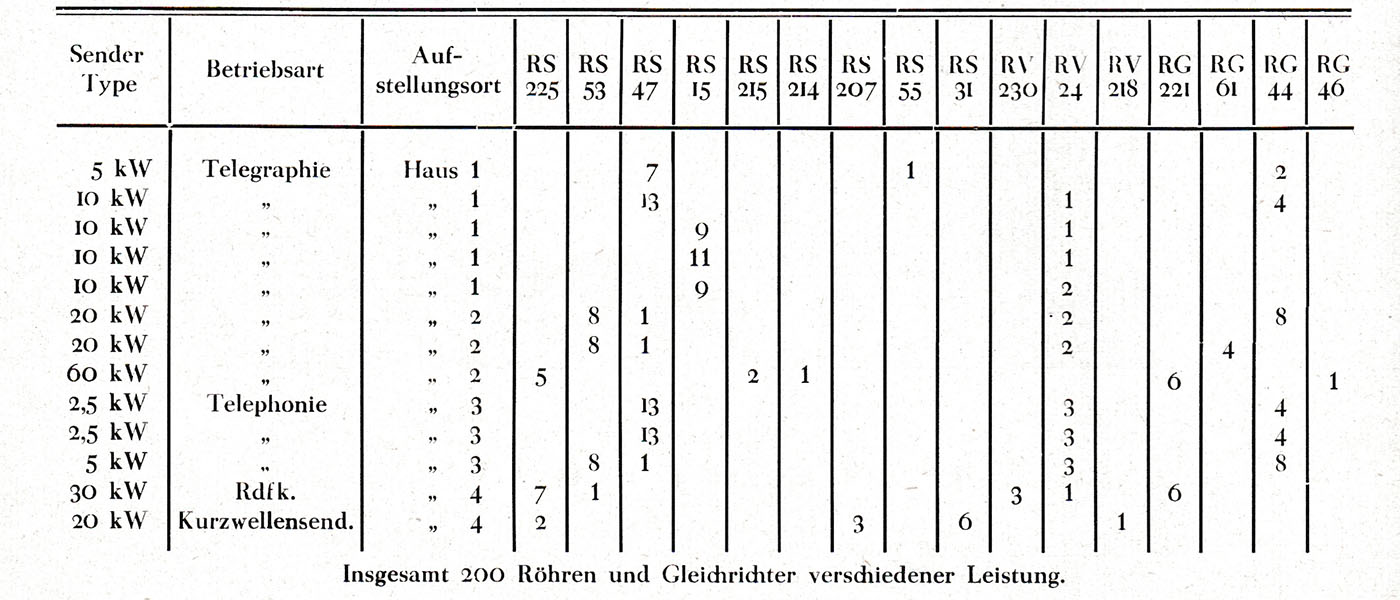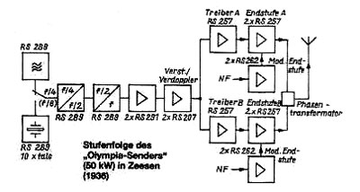 Sendehaus 5 und 61936 erfolgte, in Vorbereitung der Olympischen Spiele ein weiterer Ausbau der Sendestation. Das Gelände wurde auf eine Fläche von 190 Hektar vergrößert. Etwa 200 m von Sendehaus 4 entfernt wurden die Sendehäuser 5 und 6 gebaut. Diese hatten die Form eines Kreuzes. Sie bestanden u. a. aus je einem 500 m² großem Sendersaal.Haus 5 wurde von Telefunken mit 4 Sendern ausgerüstet. Leiter dieses Sendehauses wurde Herr Hammer (später Leiter des "Deutschlandsender III in Herzberg/Elster). Haus 6 wurde von Lorenz mit 4 Sendern ausgerüstet. Leiter dieses Sendehauses wurde Herr Erich Schwarzkopf. Jeder der acht Sender hatte eine Trägerleistung von 40 kW. Die Sender trugen die bekannte Bezeichnung "Olympia Sender". Eine Kombination von Parallel- und Gegentaktschaltung von vier Senderöhren des Typs RS 257 ermöglichte die hohe Sendeleistung.