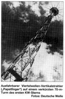 1938 wurden vom Sender Zeesen über 51 Programmstunden/Tag auf 19 Kurwellen-Frequenzen gesendet. Während der ersten Kriegsjahre errichtete man in Zeesen vier richtungsumschaltbare Rhombusantennen an vier 40-m-Holzmasten. Diese zeichneten sich durch eine relativ große Frequenzbandbreite und gute Abstrahlungsbündelung aus. 1939 wurde der 70 m hohe Holzturm aus dem Jahr 1931 demontiert. Stattdessen installierte man auf einem der 70-m-Türme des Antennensterns 1 einen ausfahrbaren Vertikalstrahler mit Radials als Gegenpotential und Selbstabstimmung, der durch fernabstimmbare mechanische Längenveränderung die Abstrahlung über einen großen Frequenzbereich, von 5 bis 30 MHz, ermöglichte. Eine, für damalige Verhältnisse, spektakuläre technische Entwicklung im Antennenbau. Diese Antenne erhielt in Insiderkreisen die Bezeichnung "Papstfinger", da zuvor eine derartige Konstruktion bei Radio Vatikan errichtet worden war.