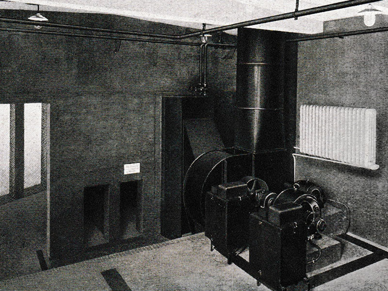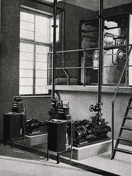 Als Kühlwasser wurde Regenwasser benutzt welches auf dem Dach des Nebengebäudes aufgefangen und einem Bassin von 18 m³ Inhalt zugeführt wurde. Spezialkreiselpumpen sorgten für den Umlauf des Wassers in der Anlage.